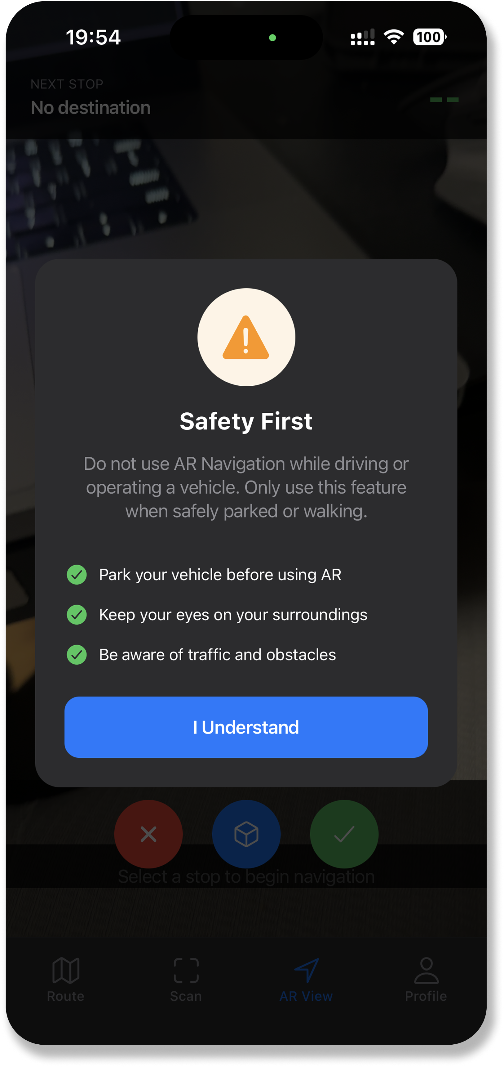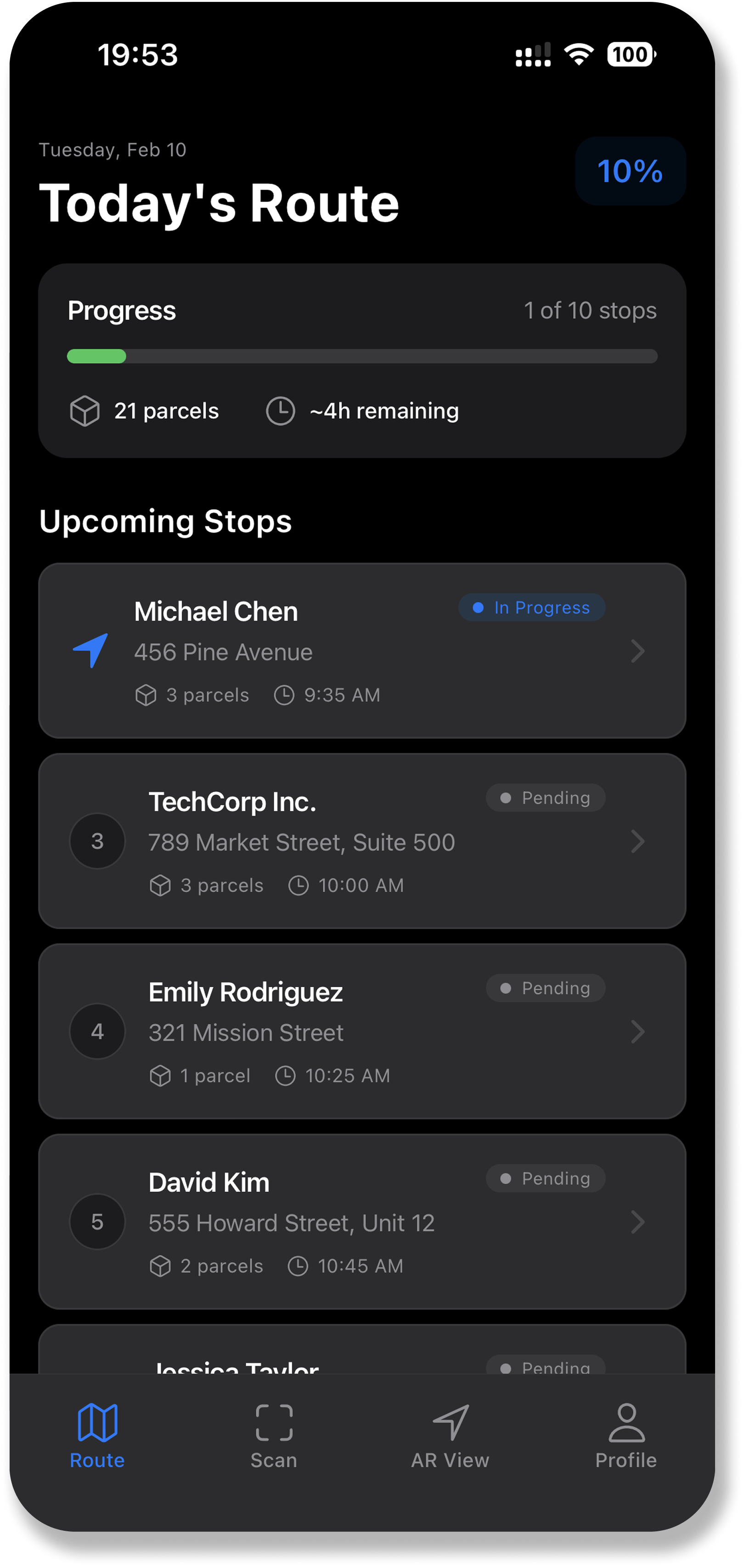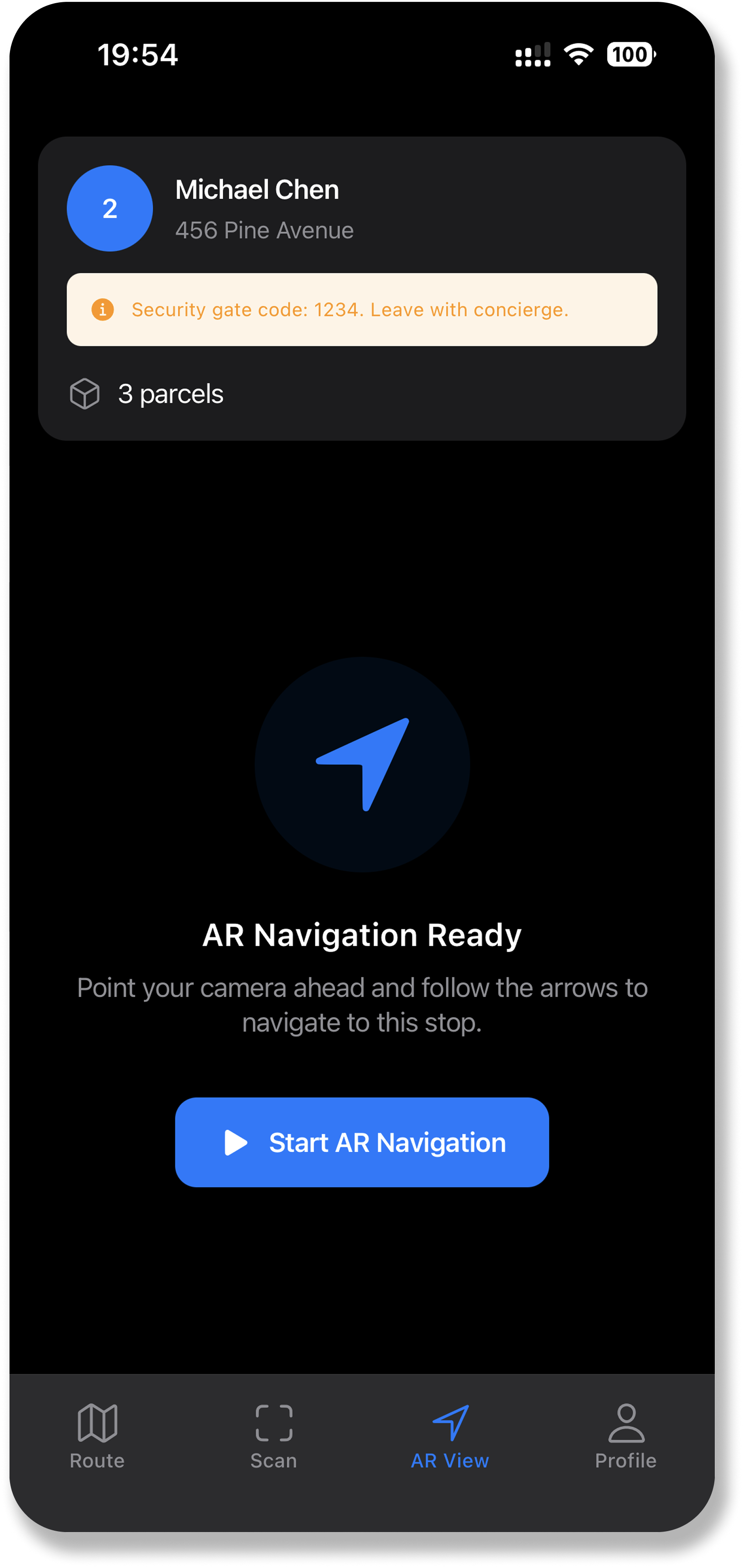 A single delivery loop: route → AR cues → scan/verify → confirm → next stop.