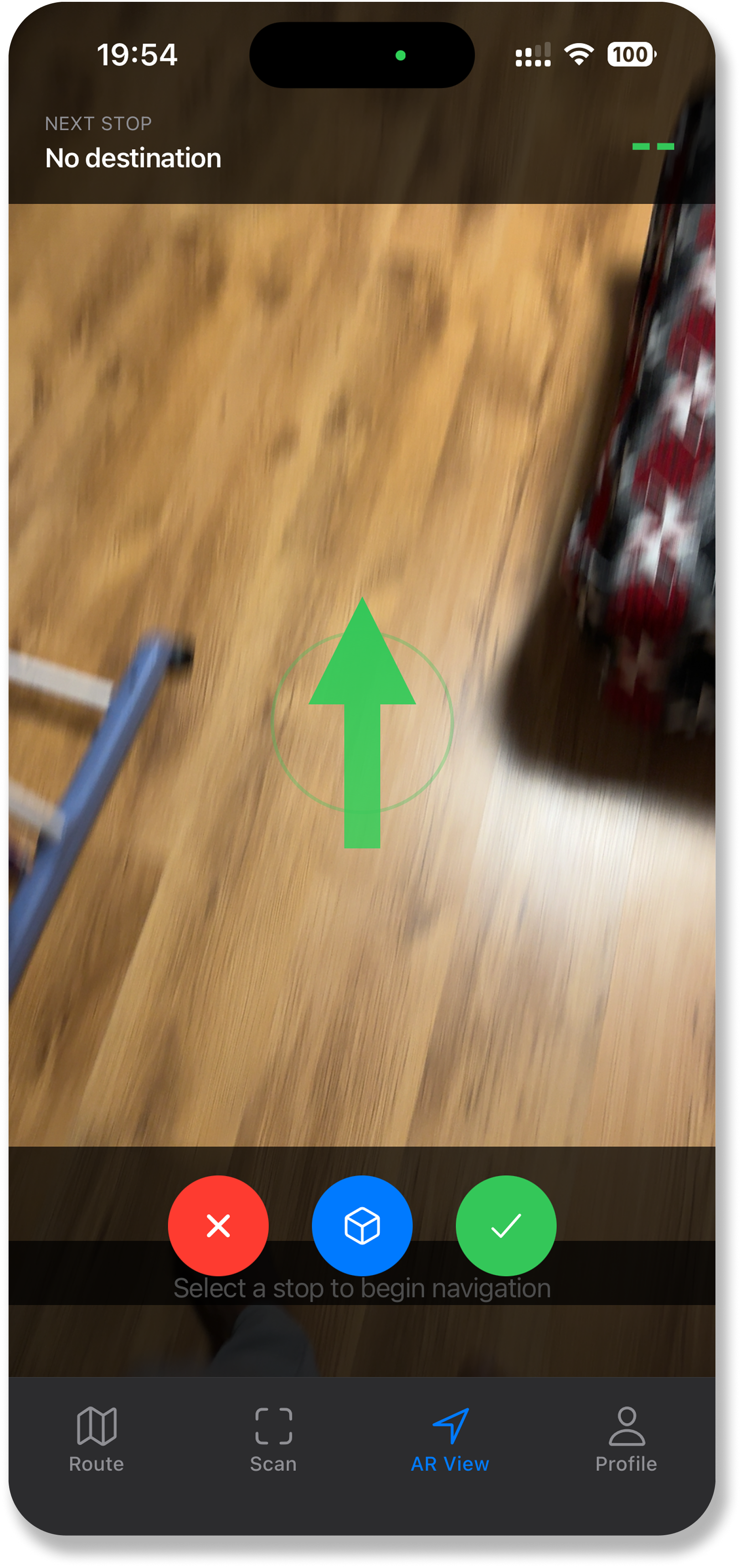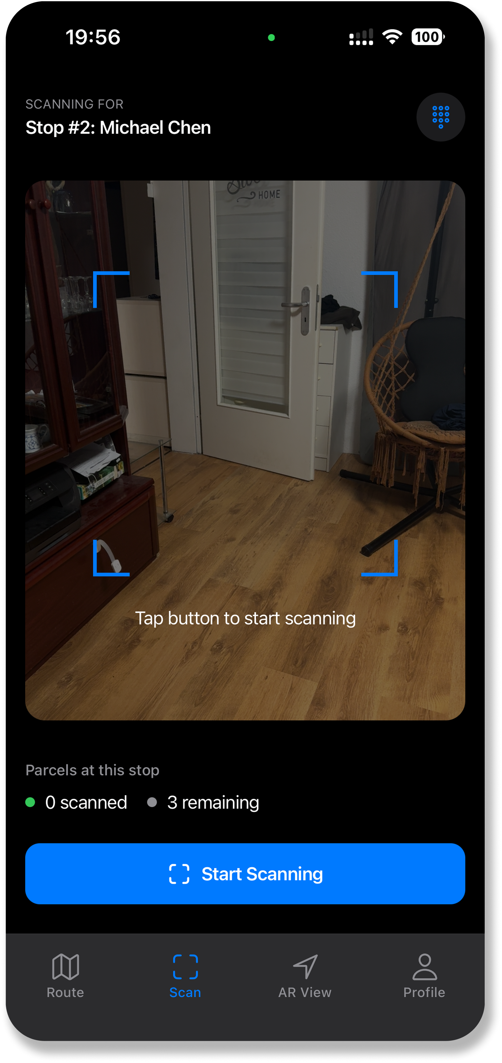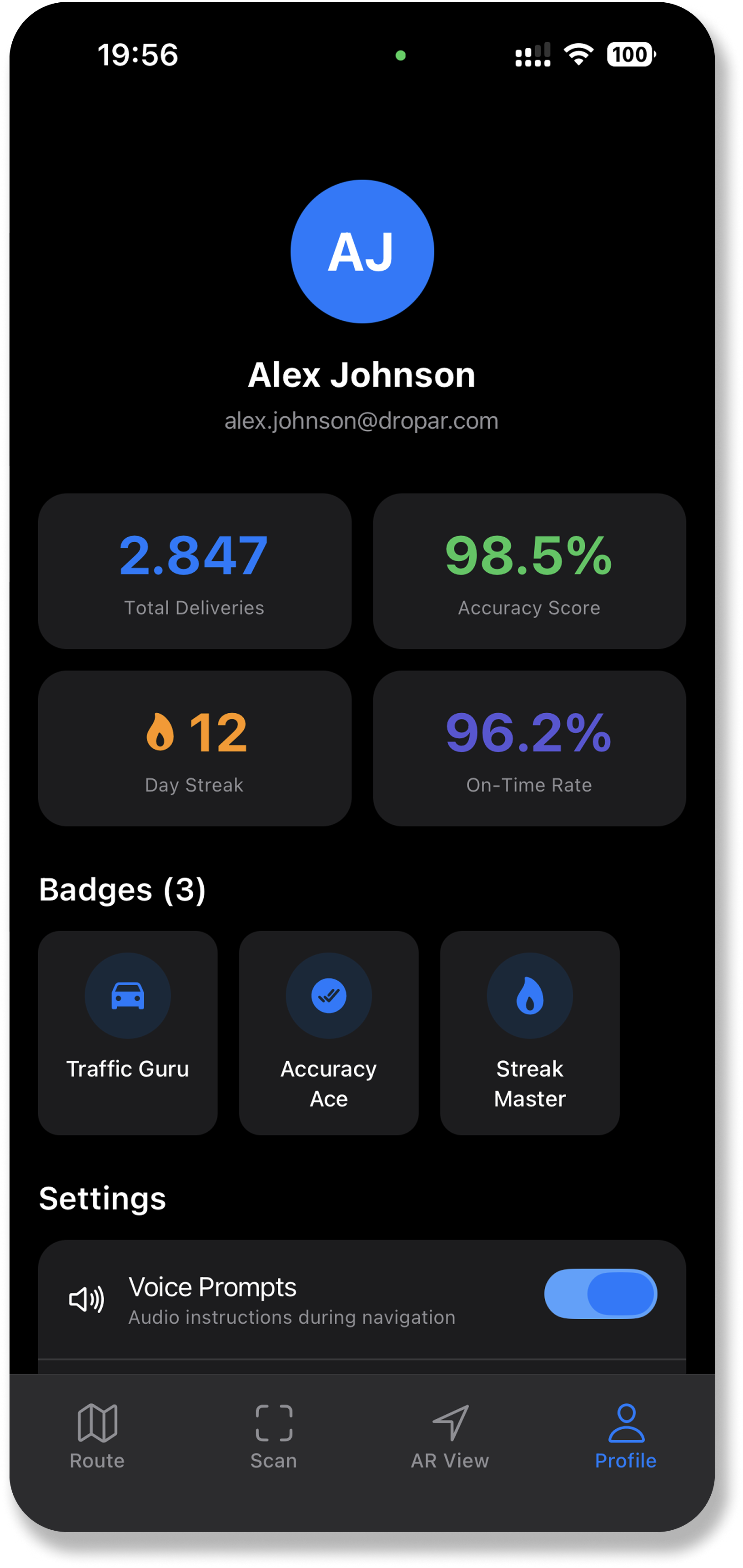 A single delivery loop: route → AR cues → scan/verify → confirm → next stop.